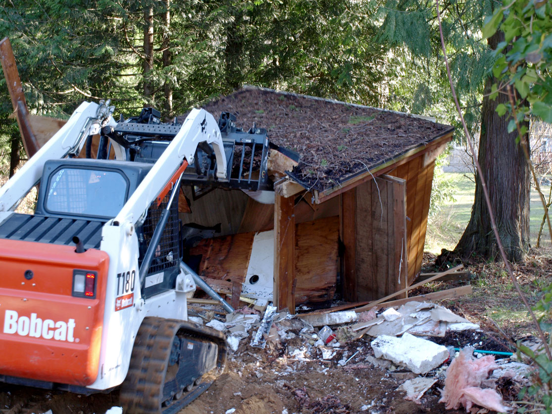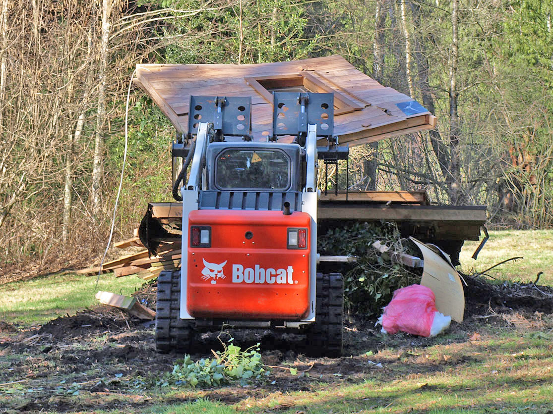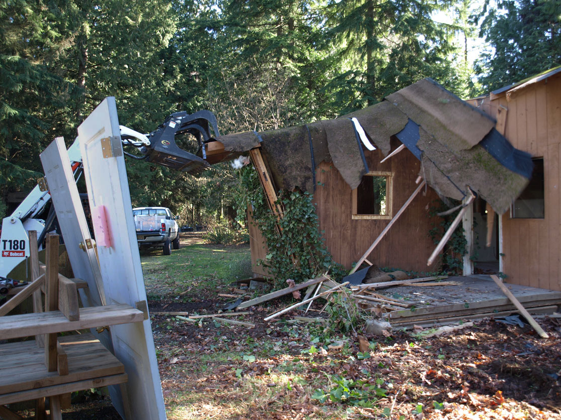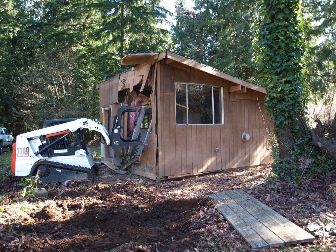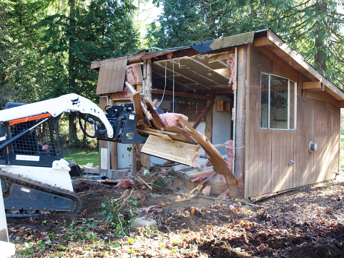 This unused cabin needed to be removed from the property. Here is shown the progression of the demolition with time stamps. Total time from start to stacked structure debris for disposal --- 2 hours!