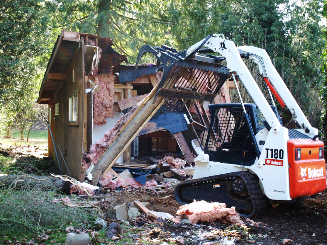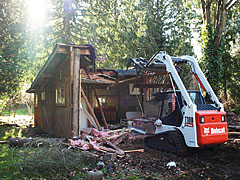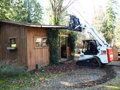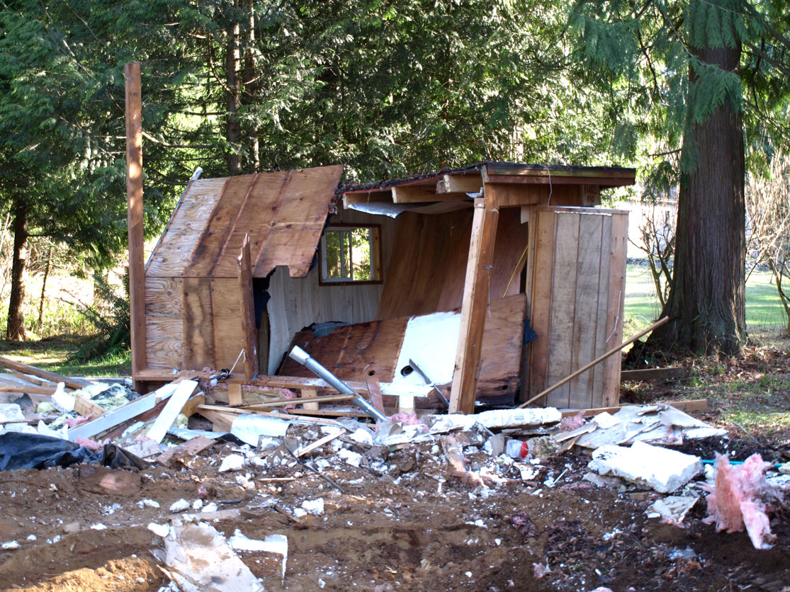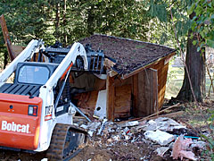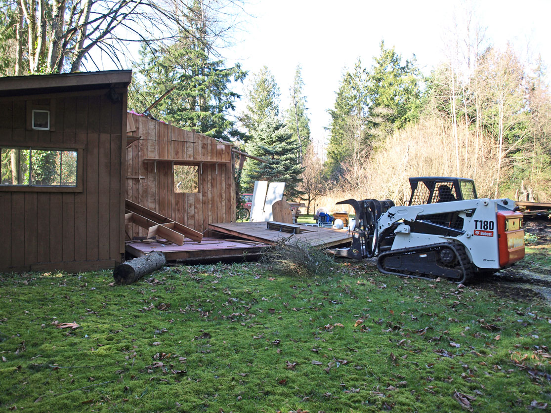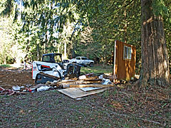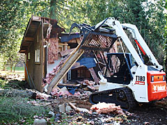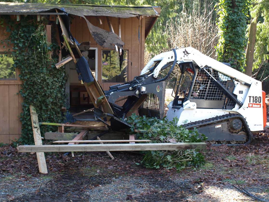 This unused cabin needed to be removed from the property. Here is shown the progression of the demolition with time stamps. Total time from start to stacked structure debris for disposal --- 2 hours!