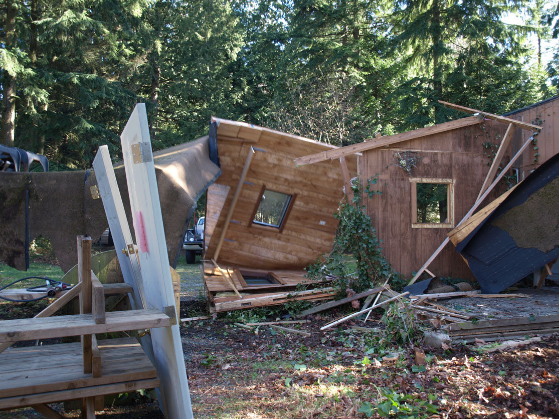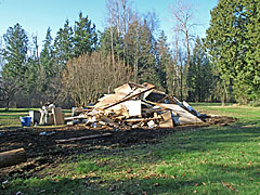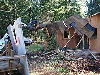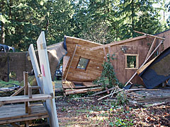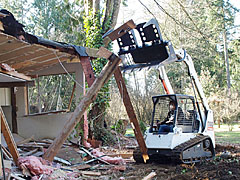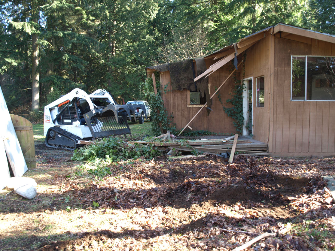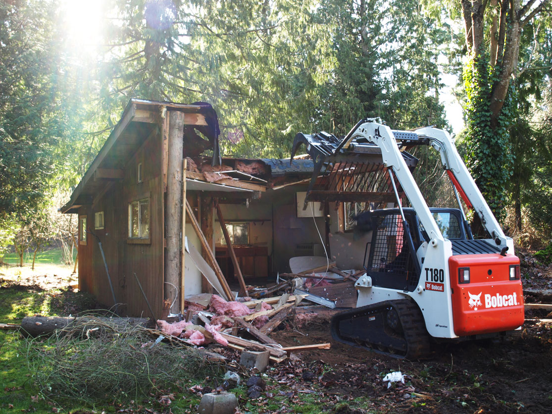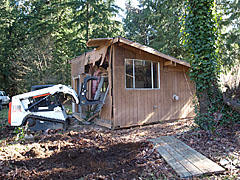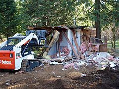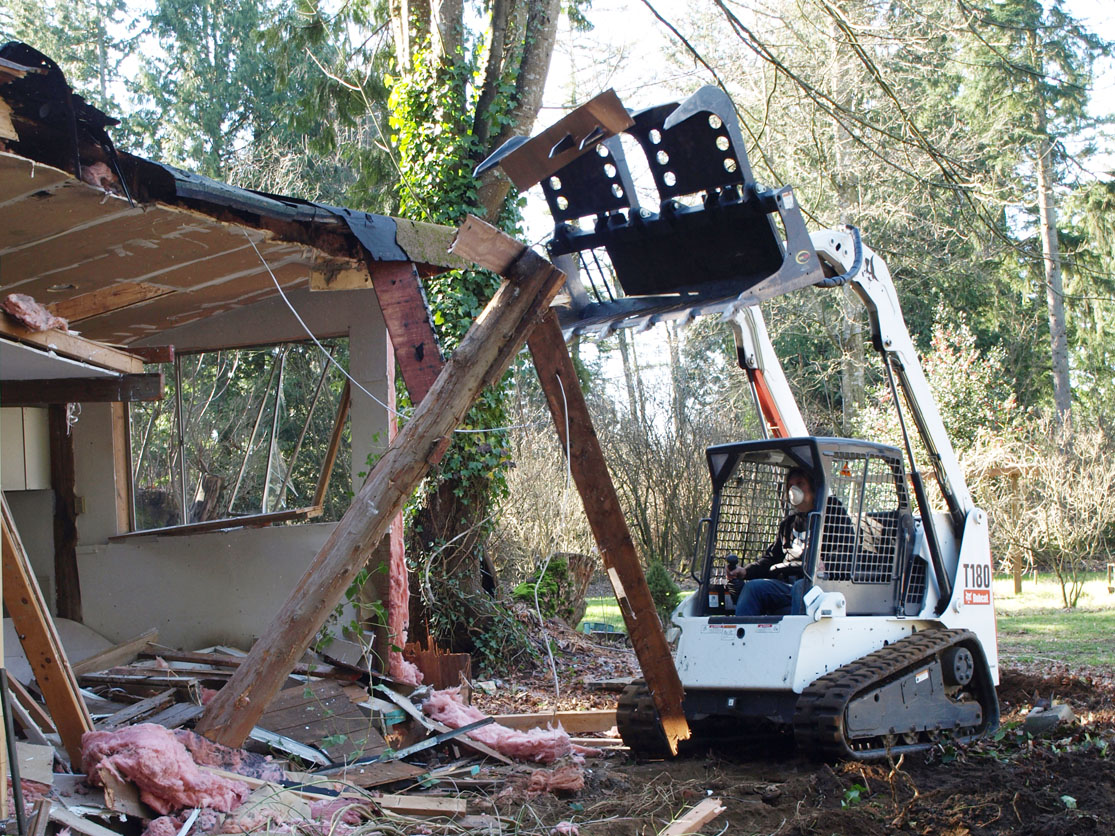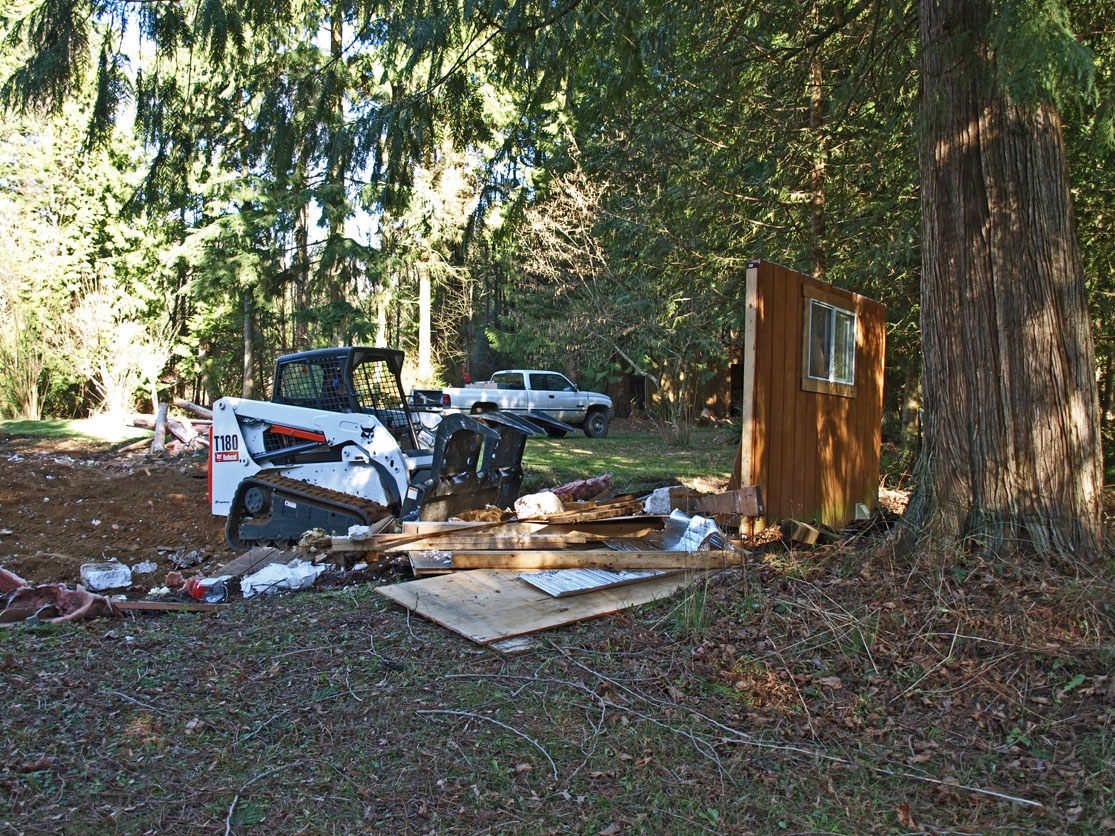 This unused cabin needed to be removed from the property. Here is shown the progression of the demolition with time stamps. Total time from start to stacked structure debris for disposal --- 2 hours!